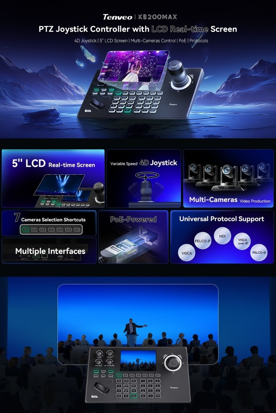 • Supports VISCA, RS232, RS422/485, ONVIF, NDI, and Visca over IP