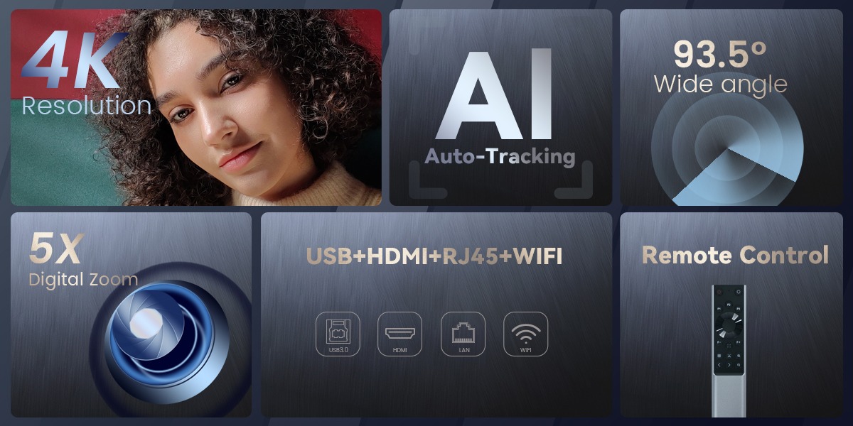 Tenveo TEVO-MEETBAR 4K UHD All-in-One Video Bar Conference Webcam with AI Auto-Tracking, Wide-Angle Camera Lens, 5x Digital Zoom, IR Remote Control & Multiple Interfaces (USB HDMI RJ45) for Business Meeting and Video Conferencing
