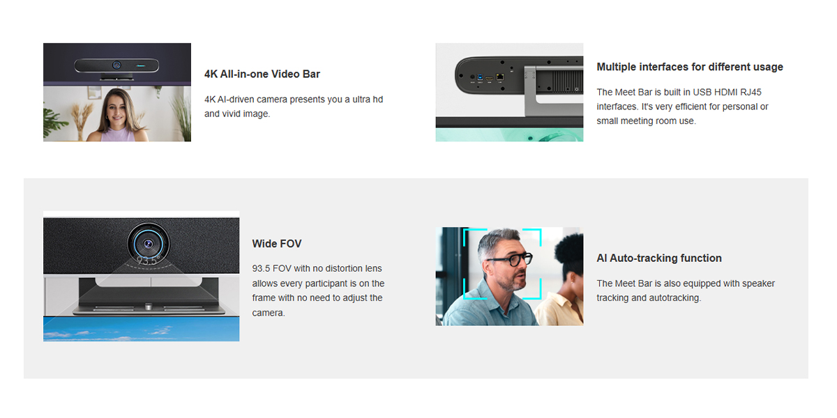The Meet Bar 4K by Tenveo is an all-in-one video bar designed for professional conferencing in small to mid-sized meeting rooms. It delivers ultra-HD 4K resolution at 30 fps with a wide 93.5° field of view so more participants stay in frame. Equipped with 8 built-in microphones and a speaker, it picks up clear voice from up to 6 meters, while AI auto-tracking features include speaker tracking and participant framing. With versatile interfaces—USB, HDMI, and RJ-45—plus compatibility with Zoom, Microsoft Teams, Webex and others, it provides plug-and-play operation on Windows or Mac. Compact yet powerful, it also supports desktop, TV or wall mounting for flexible deployment.