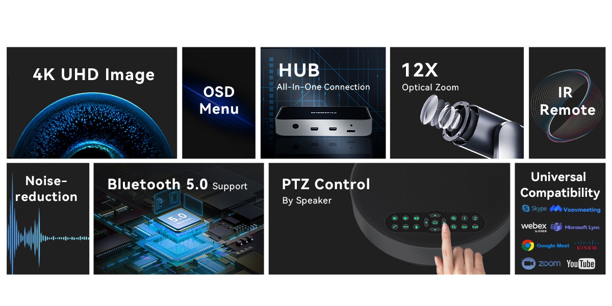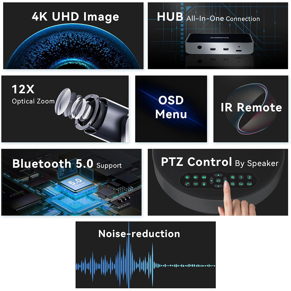 Tenveo TEVO-VA512GROUP 4K UHD PTZ Video Conference Camera with 12X Optical Zoom, Bluetooth 5.0, 1/2.8" SONY CMOS, IR Remote Control, HDMI / Display Port Interface, Noise Reduction for Business Meeting and Video Conferencing