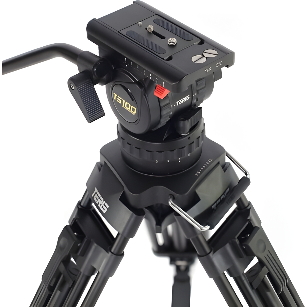 The Teris TS100 Fluid Head Tripod System provides smooth and stable movement for professional video work. It features a quick setup two-stage design, adjustable drag and counterbalance, and supports loads up to 12 kg. Height adjusts from 69 to 178 cm. Available in durable aluminum or lightweight carbon fiber versions.