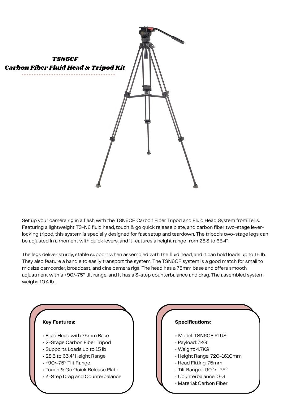 The legs deliver sturdy, stable support when assembled with the fluid head, and it can hold loads up to 15 lb. They also feature a handle to easily transport the system. The TSN6CF system is a good match for small to midsize camcorder, broadcast, and cine camera rigs. The head has a 75mm base and offers smooth adjustment with a ±90/-75° tilt range, and it has a 3-step counterbalance and drag. The assembled system weighs 10.4 lb.