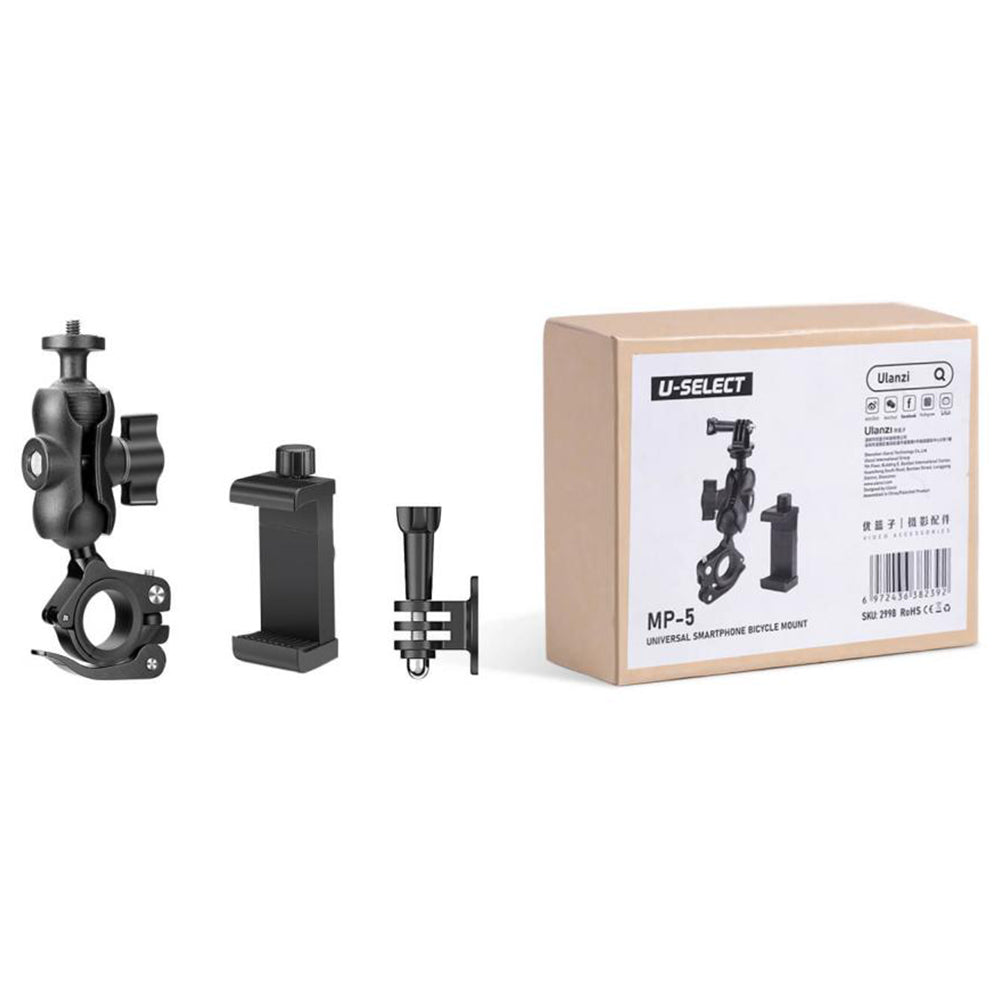 Locking Mode. Equipped with phone holder and GoPro adapter, suitable for most cell phones and action cameras. The phone holder comes with a locking mode and is designed with multi-faceted silicone pad to ensure fully locked.