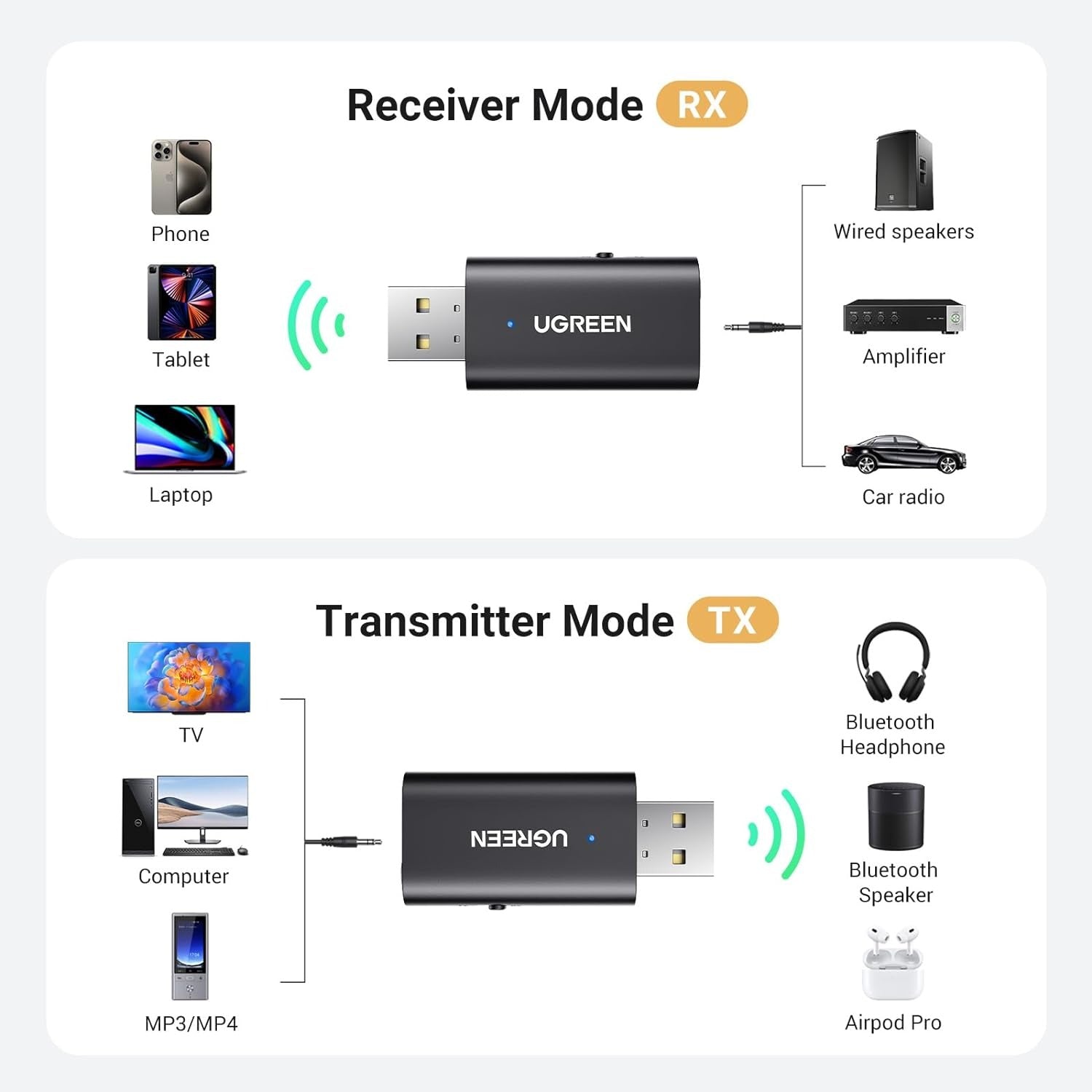 2-IN-1 Bluetooth Transmitter and Receiver: UGREEN 3.5mm wireless Bluetooth adapter provides TX and RX mode, use it as a transmitter or receiver as you need. This Aux Bluetooth adapter helps to turn non-Bluetooth devices into Bluetooth-enabled, such as TVs, PCs, Cars, and Speakers. Just connect the Bluetooth converter to your old devices and enjoy high-quality sound from wireless devices. (Note: Phone calls only be supported in RX mode, not in TX mode.)