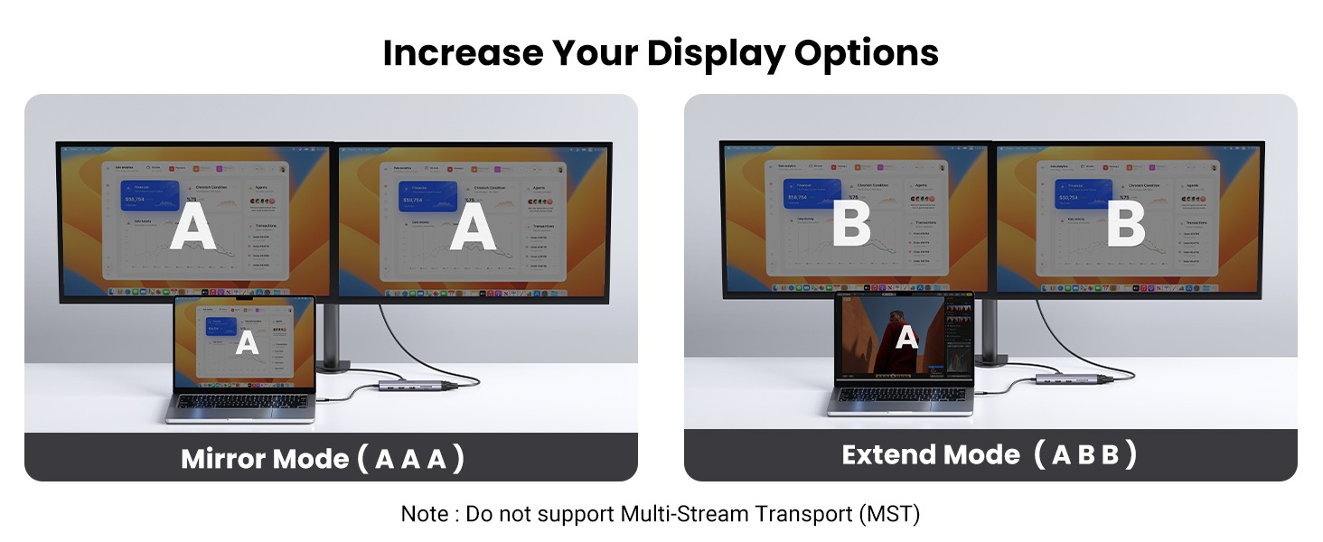 ● Dual Monitor Extended: The 4K HDMI and 1080P VGA ports can be used for different display devices like monitor, TV, projector at the same time. The maximum output resolution reaches 4K 30Hz via HDMI and 1080P 60Hz via VGA. Mirror mode AAA and extended mode ABB are supported both on Mac and Windows