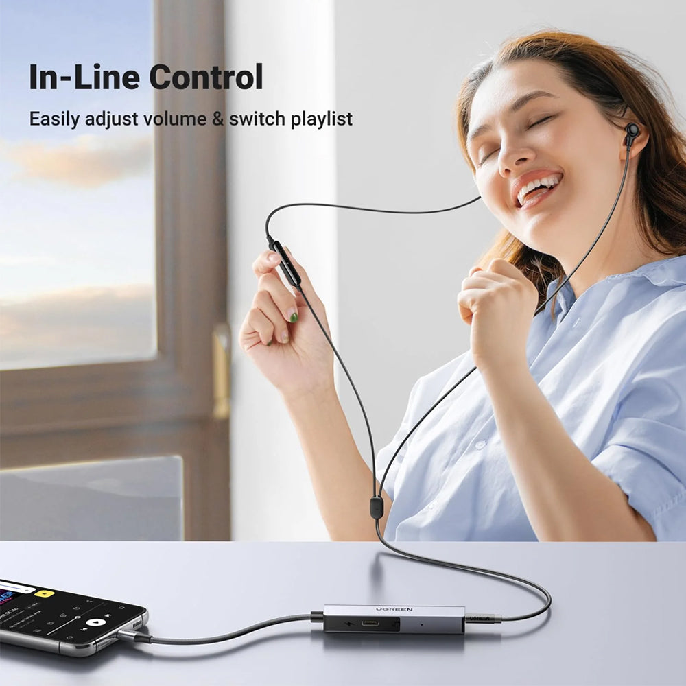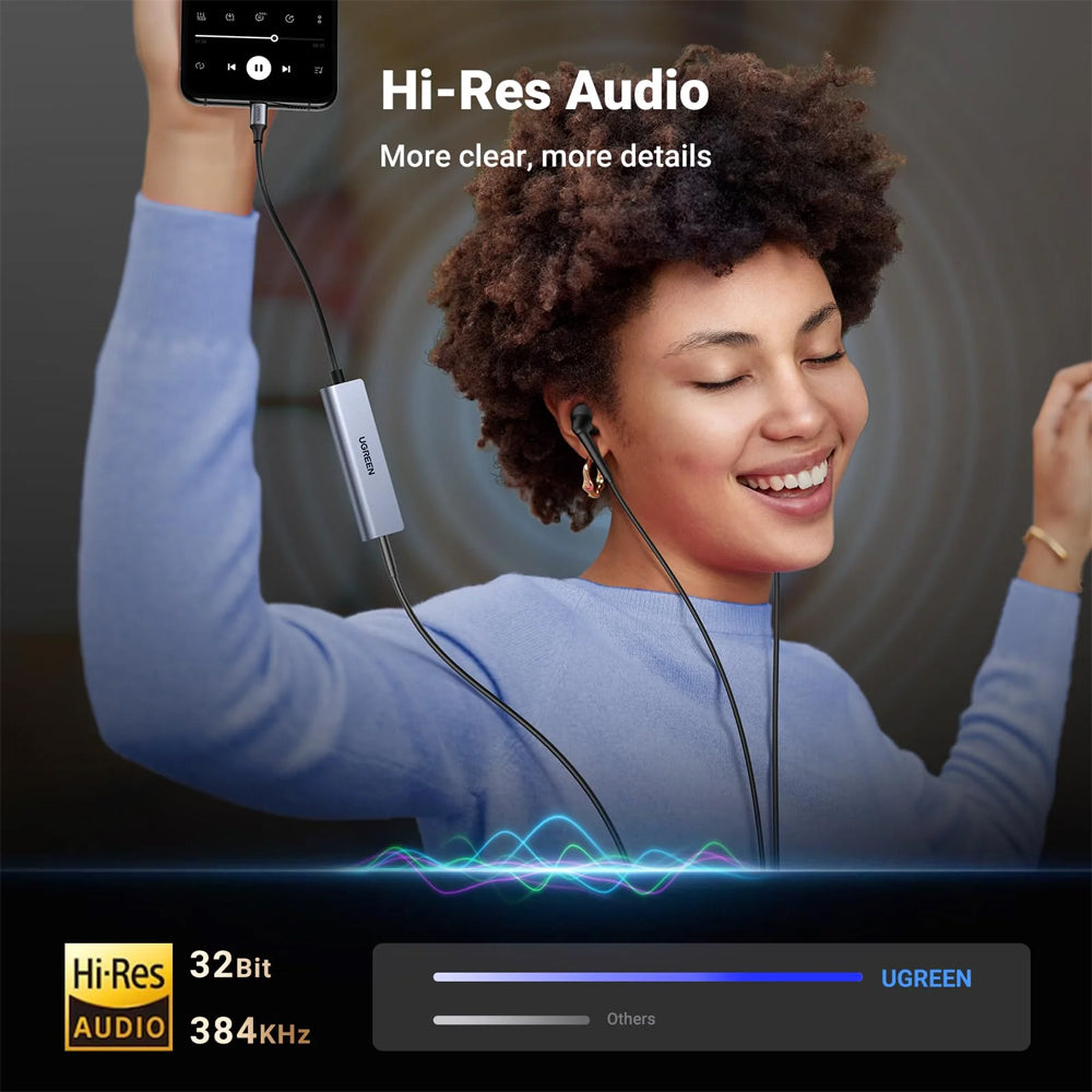 With a premium Hi-Res DAC chip, UGREEN USB C Audio and Charging Splitter delivers high-fidelity audio and provides excellent and stable decoding performance. It supports a maximum sampling rate of 32bit/384Khz, and produces a balanced, natural, and realistic sound quality.
