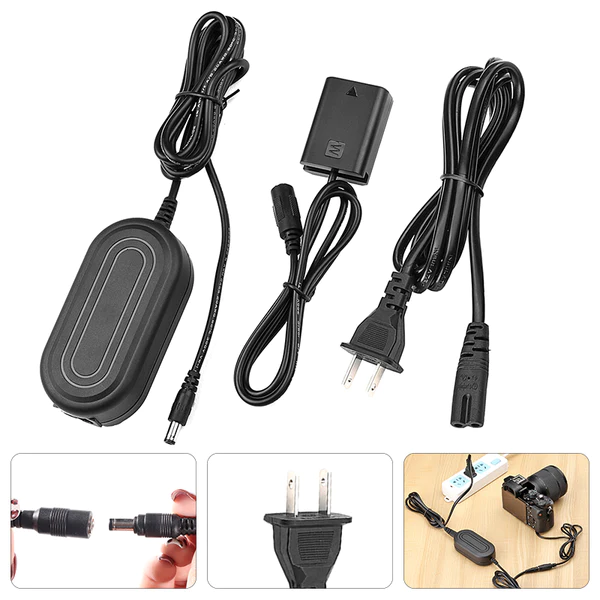 One end of the charger is an NP-FW50 dummy battery, and the other end is a standard two-pin plug