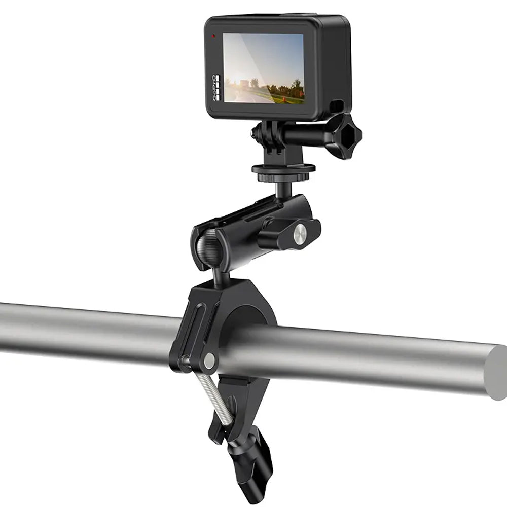 Ulanzi Bike/Motorcycle Handlebar Clamp Mount for GoPro/Insta360 Action Cameras. This Handlebar Clamp mount offers an all-around anti-slip lock to keep your device stable, ensuring high-quality, clear images. The silicone pad enhances the anti-slip performance, while the independent knob locks securely in place. Crafted from sturdy aluminum alloy, it promises durability. Compatible with various bike models, it features an independent spiral fixing lock and anti-slip silicone spacer, fitting handlebars with diameters of 8-35mm. With an included GoPro adapter, installation is a breeze, allowing you to quickly start shooting. The mount's universal holder enables 360° dual-directional adjustment, seamlessly switching between portrait and landscape modes. Discover personalized angles by clipping it onto handlebars, pipes, and under the seat, and unlock a world of dynamic shooting possibilities with ease.