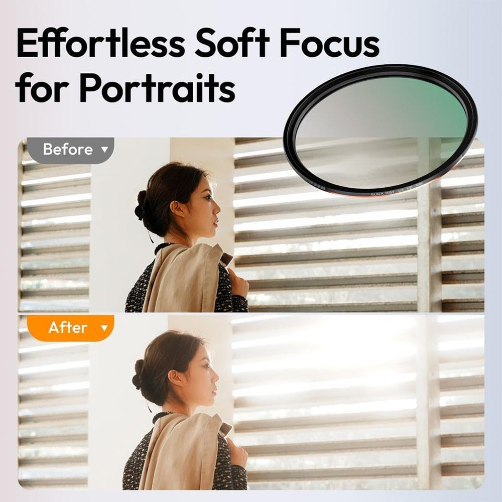 The Ulanzi F205 MF01 1/4 Black Mist Filter delivers a cinematic softness to your shots by reducing highlights and glare while preserving natural skin tones. It enhances image depth and creates a subtle, film-like atmosphere, perfect for photography and videography.