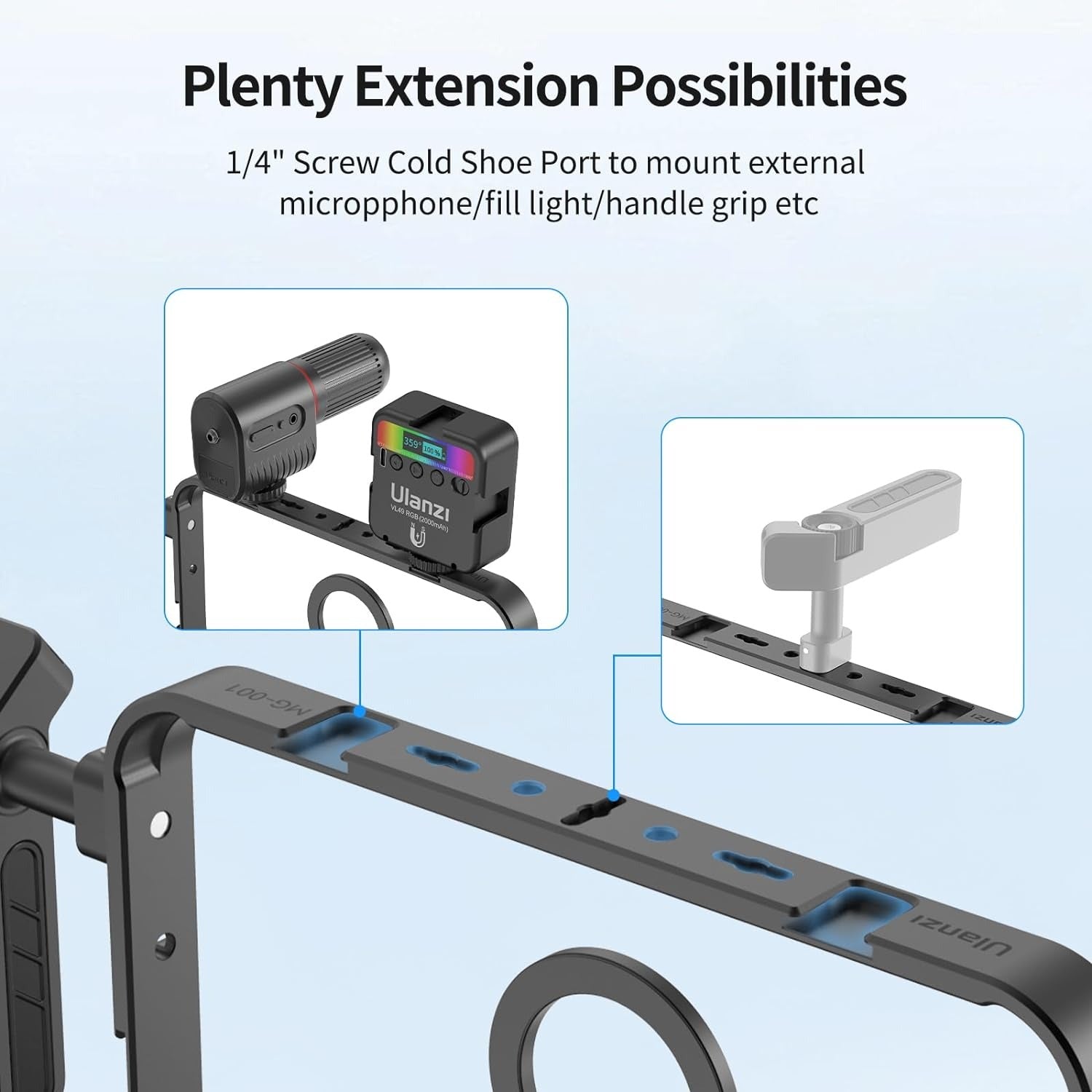 • The phone video rig frame have cold shoe and 1/4" Extension Ports for mounting a microphone, fill light and other photographic accessories