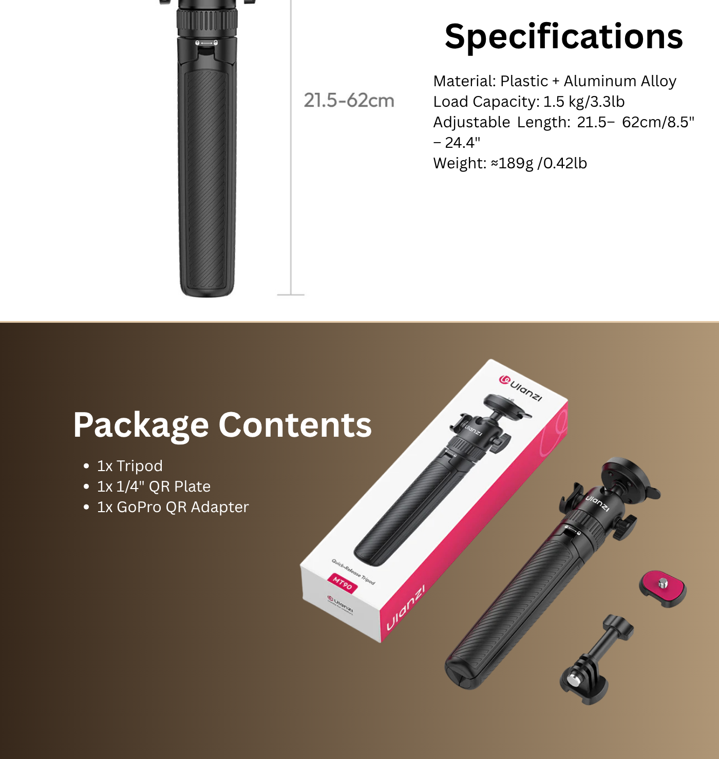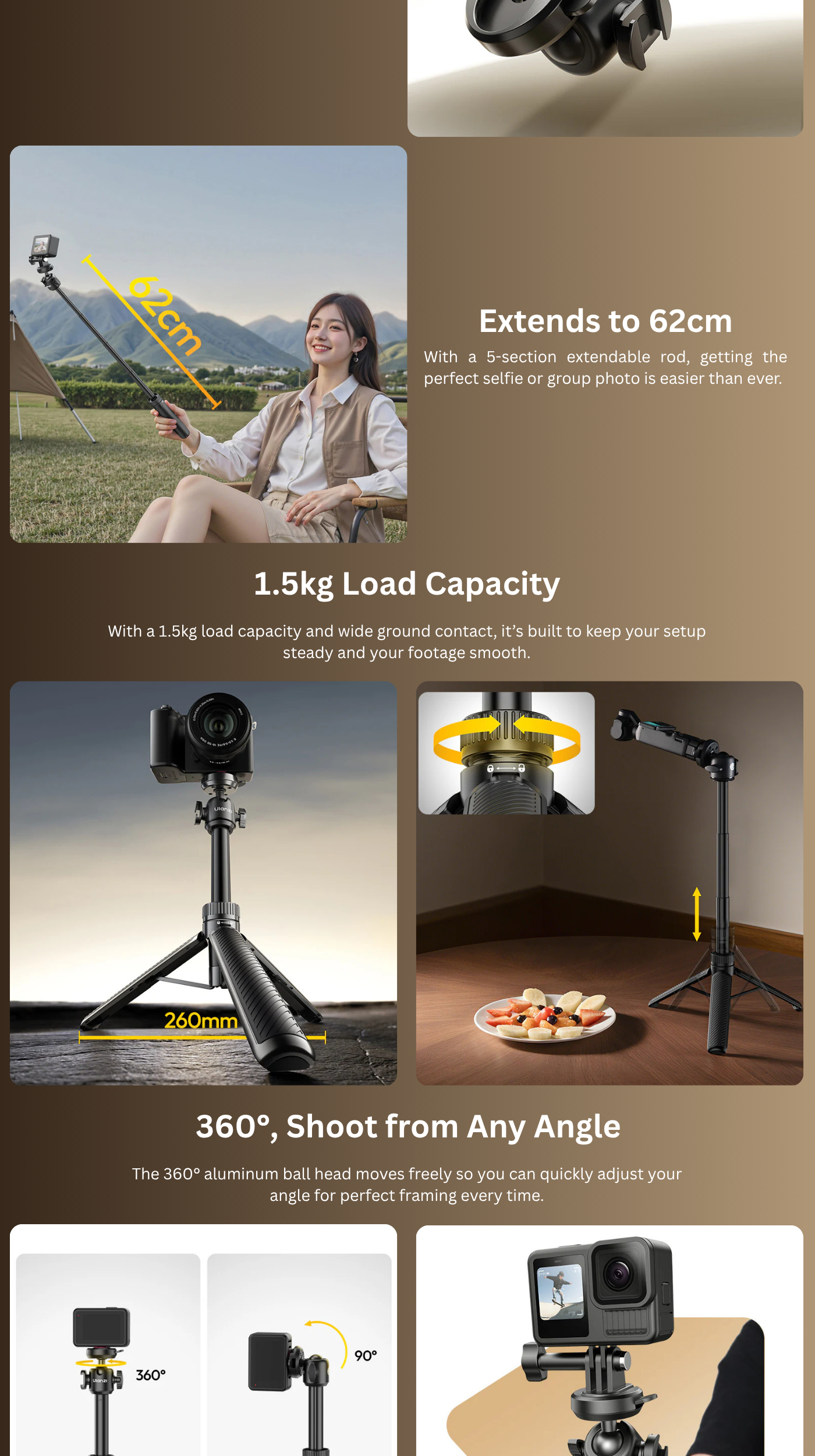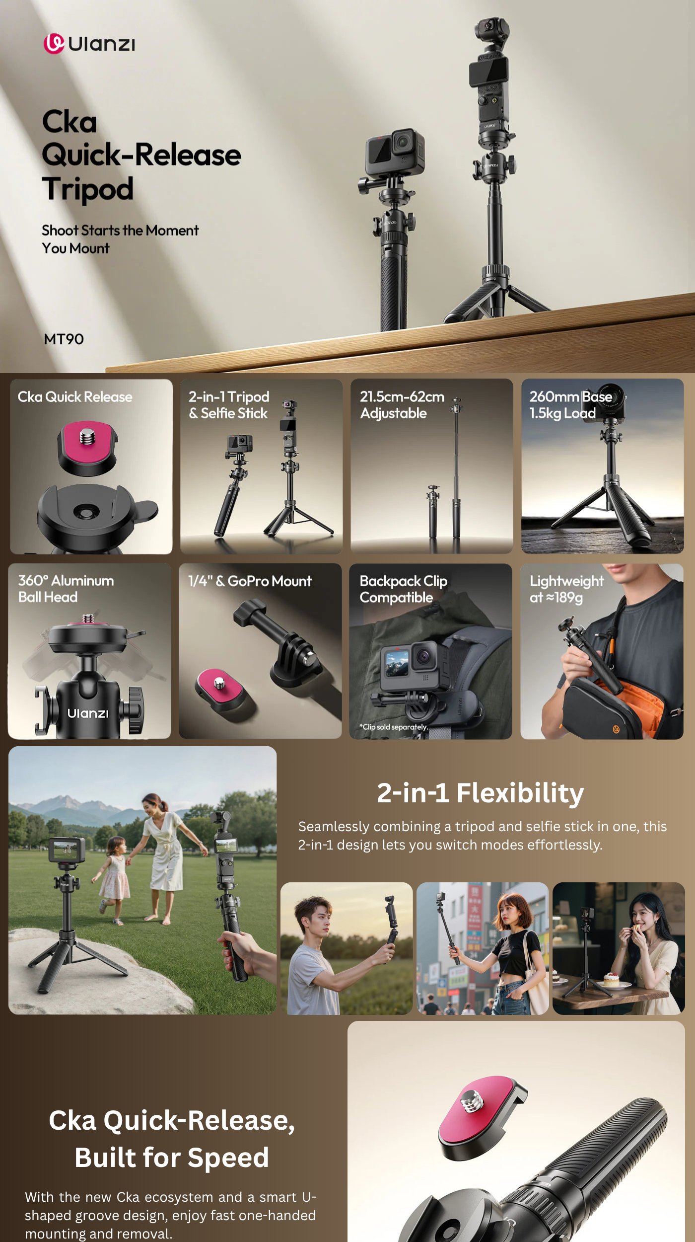 Meet the ULANZI MT90 (S027) — your compact, versatile 2‑in‑1 tripod and selfie stick with fast CKA quick‑release system. Switch instantly between stable tripod use and handheld stick mode. With a maximum extension of 62 cm, 1.5 kg load capacity, and full 360° ball head freedom, it’s ready for vlogging, travel, livestreams, action cams, and more. Comes with both 1/4″ and GoPro quick‑release plates for broad compatibility.