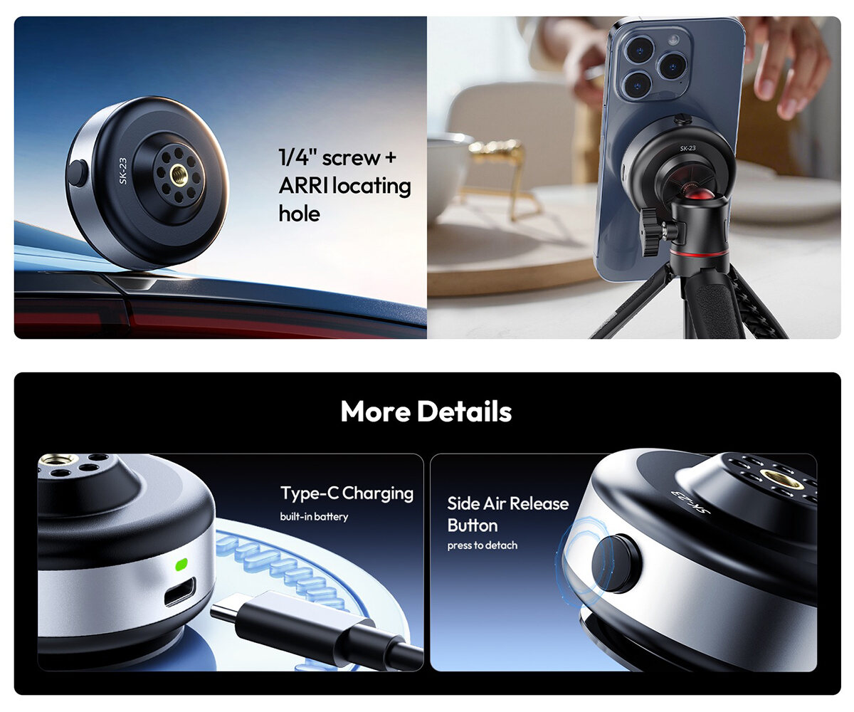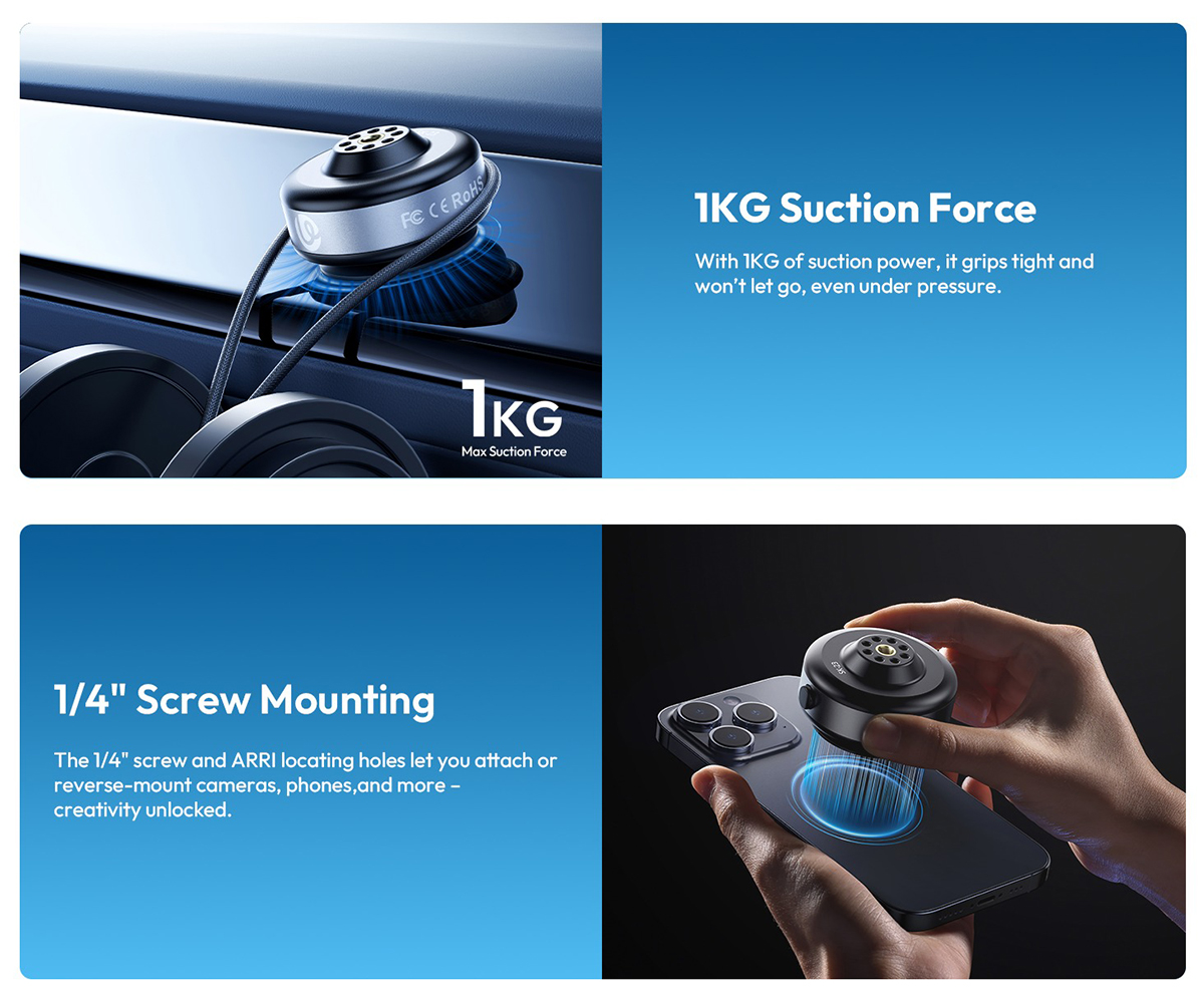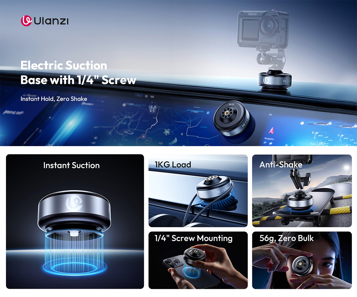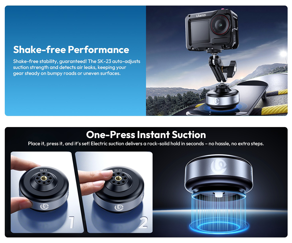 Ulanzi SK-23 One-Press Electric Suction Base Mount with 1/4" Screw + ARRI Locating Hole, 1kg Max Load Capacity Force, Auto-Adjusting Hold & Shake-Free Stability for Action Cameras, Smartphones, Photography, Vlogging & Travel | M085