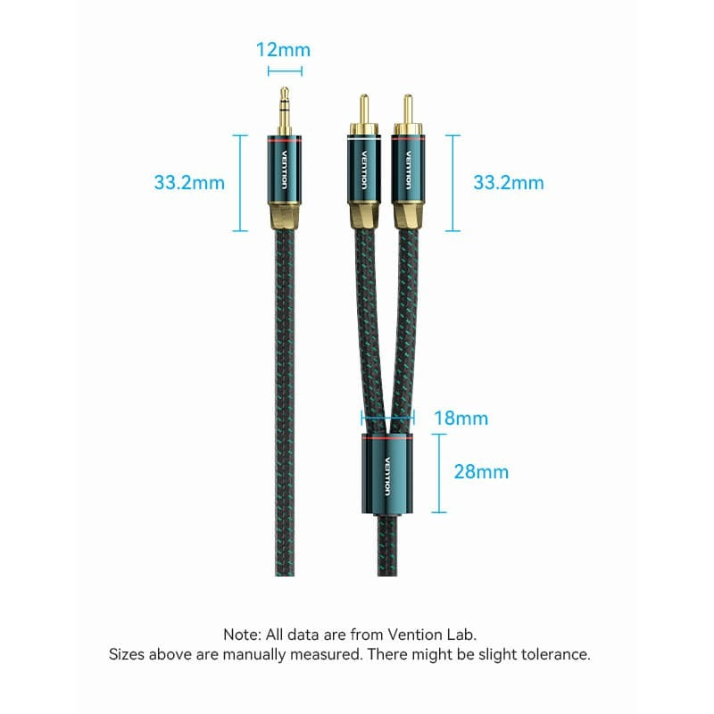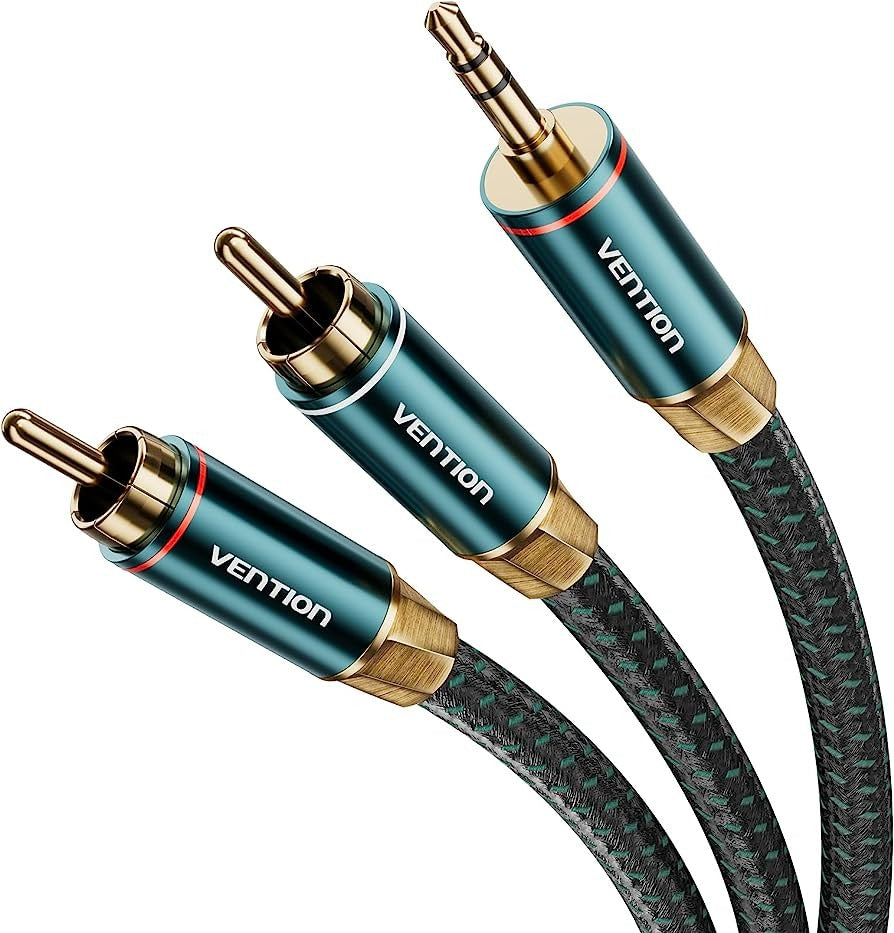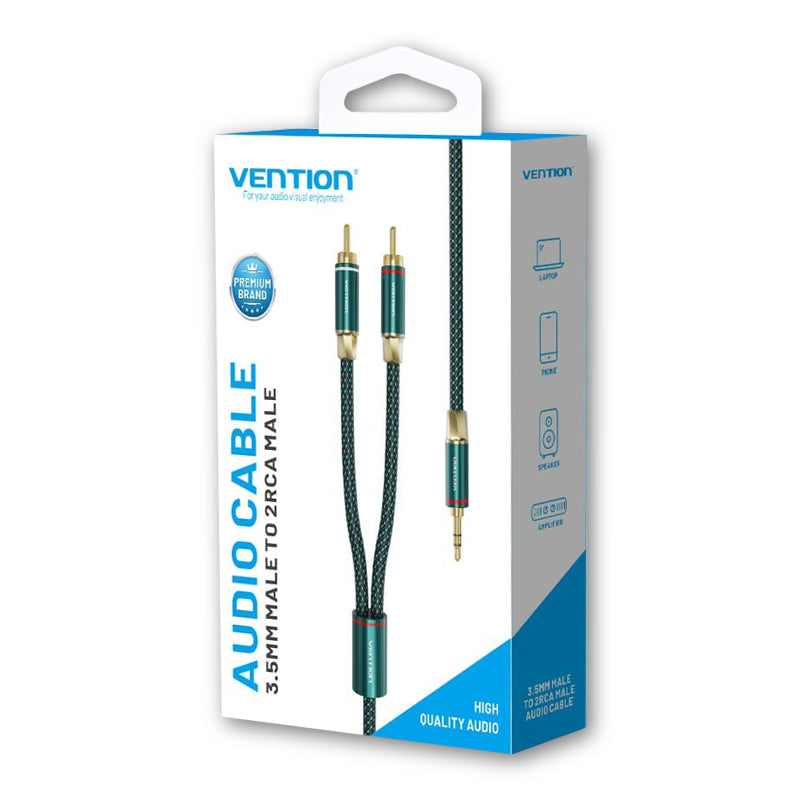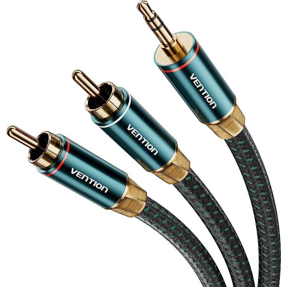 Vention 3.5mm Male to 2RCA Male Audio Extension Cable Cotton Braided Green Copper Type Gold-Plated High Frequency and Tight Bass Sound for Smartphones, Laptop, Speaker, Amplifier (1 meter) | BCSGF