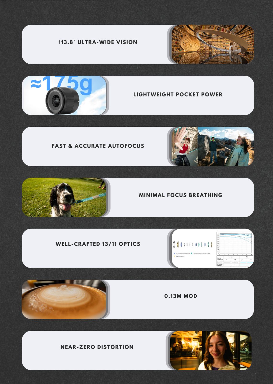 • 0.13m Minimum Focusing Distance: With a minimum focus distance of just 0.13m, emphasize dramatic foreground-background relationships, shoot in tight spaces with depth, and turn everyday scenes into eye-catching photos.