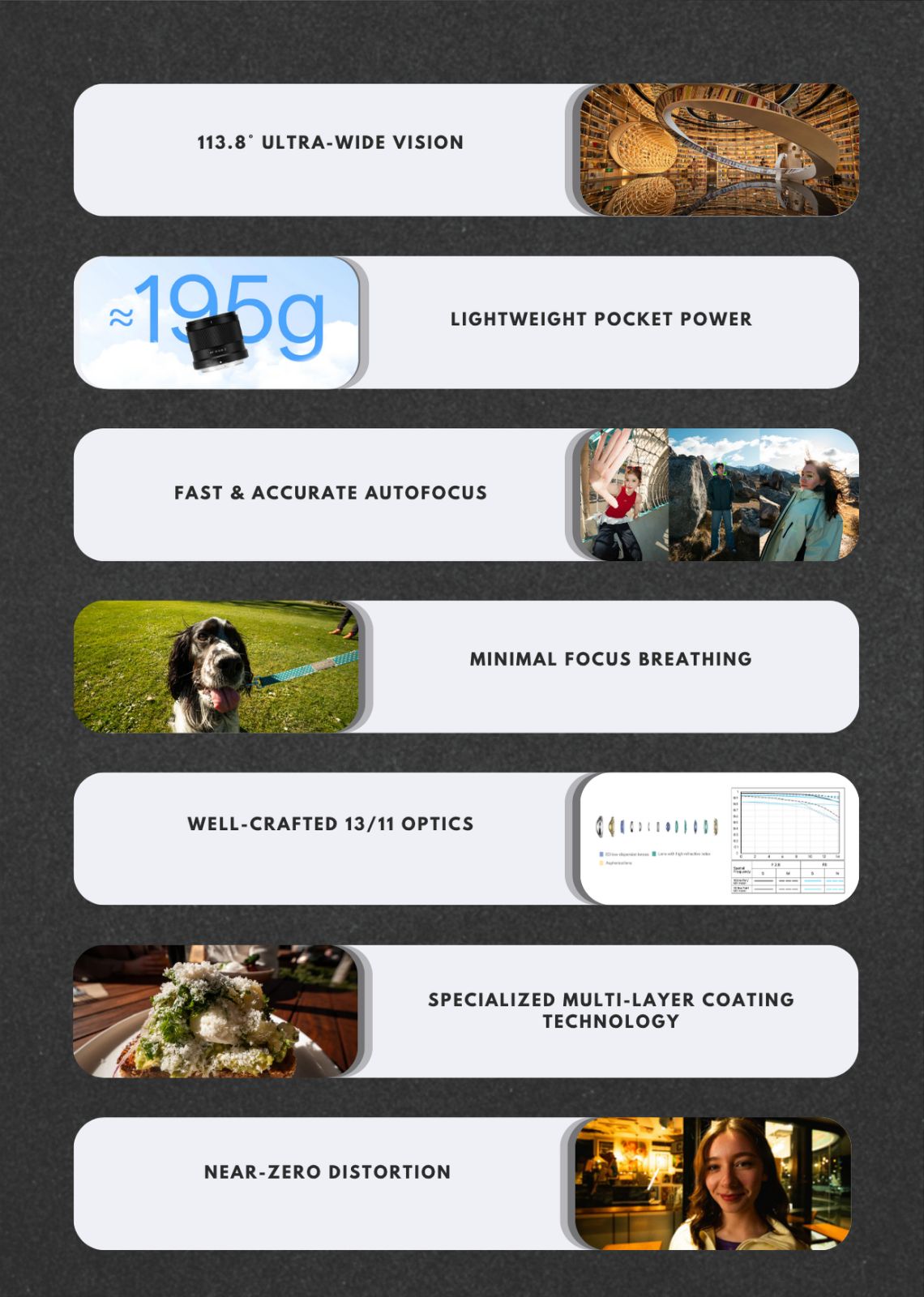 • 0.13m Minimum Focusing Distance: With a minimum focus distance of just 0.13m, emphasize dramatic foreground-background relationships, shoot in tight spaces with depth, and turn everyday scenes into eye-catching photos