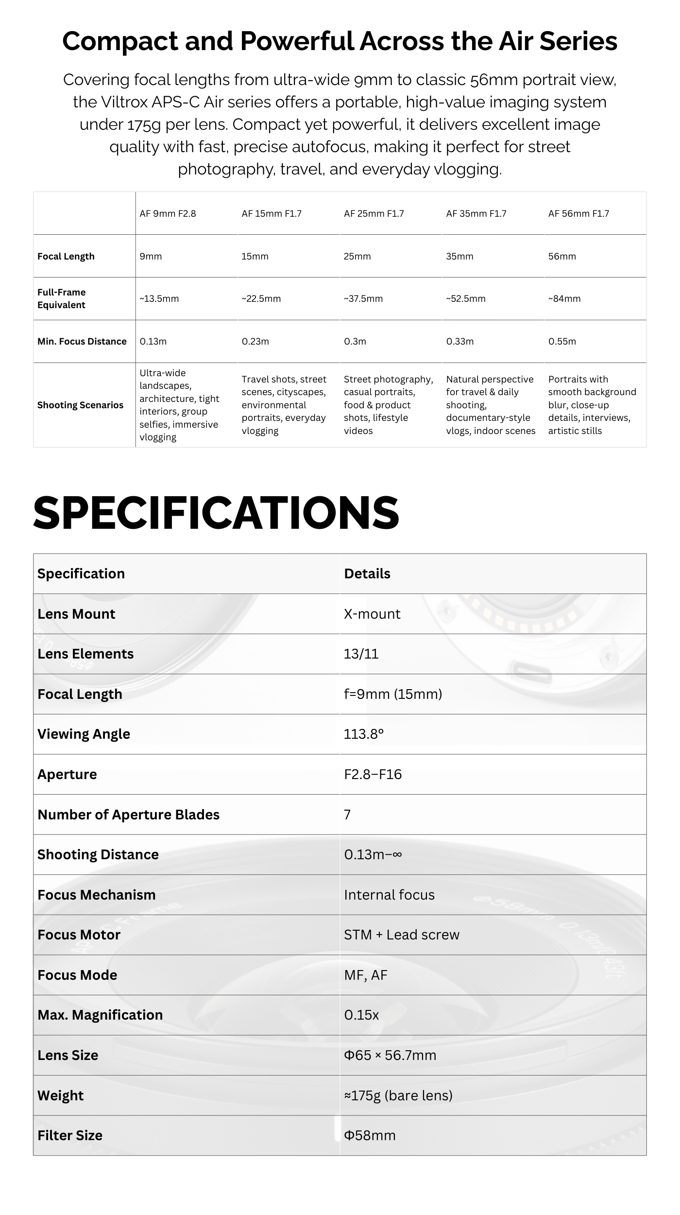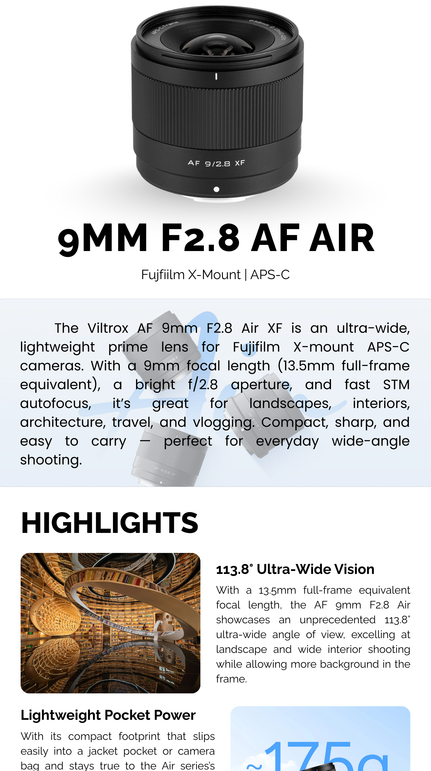 The Viltrox AF 9mm F2.8 Air XF is an ultra-wide-angle autofocus prime lens designed for Fuji X-mount shooters who want maximum portability without sacrificing image quality. With its expansive 113.8° field of view, bright F2.8 aperture, and lightweight 175g design, it’s ideal for landscapes, architecture, interiors, travel, and immersive vlogging. The lens features fast STM-driven autofocus, a close 0.13m minimum focusing distance, and excellent optical correction, making it a powerful compact option for creators who need sharp, distortion-controlled ultra-wide performance on the go.
