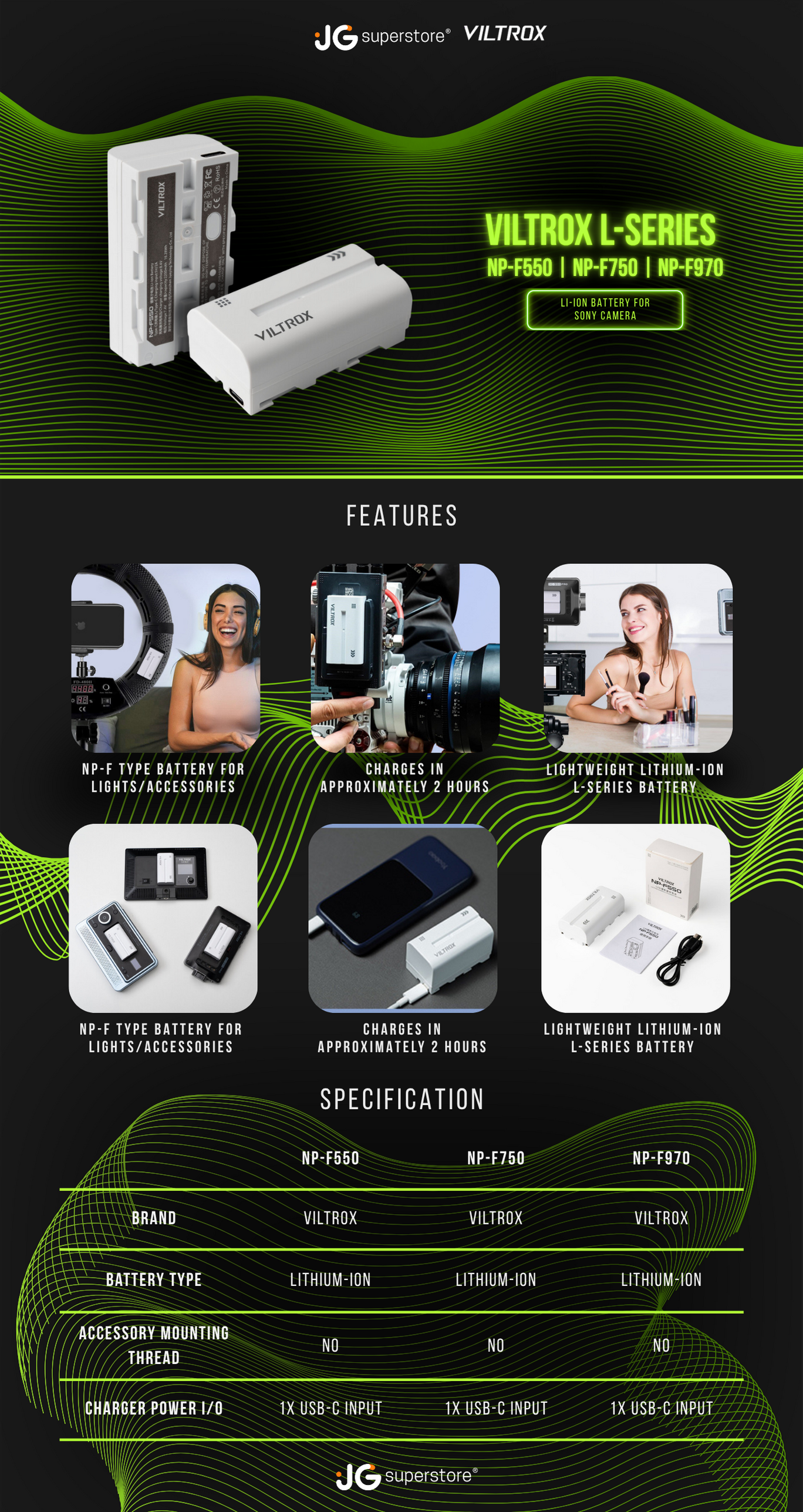 Power your lights and accessories with this white Viltrox L-Series VILTROX NP-F550 | VILTROX NP-F750 | NP-F970 Lithium-Ion Battery. This lithium-ion battery provides a long-life charge that can be recharged in approximately 7 hours. The battery charges in a standard L-series charger or by using the 5V, 2A USB input. It features a bright LED status indicator to show when the battery is charging or full.