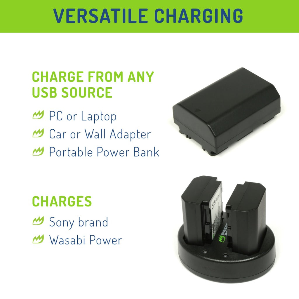 Fully charges 2 batteries at a time from any USB power source for the Sony NP-FZ100 battery and replaces the Sony BC-QZ1.