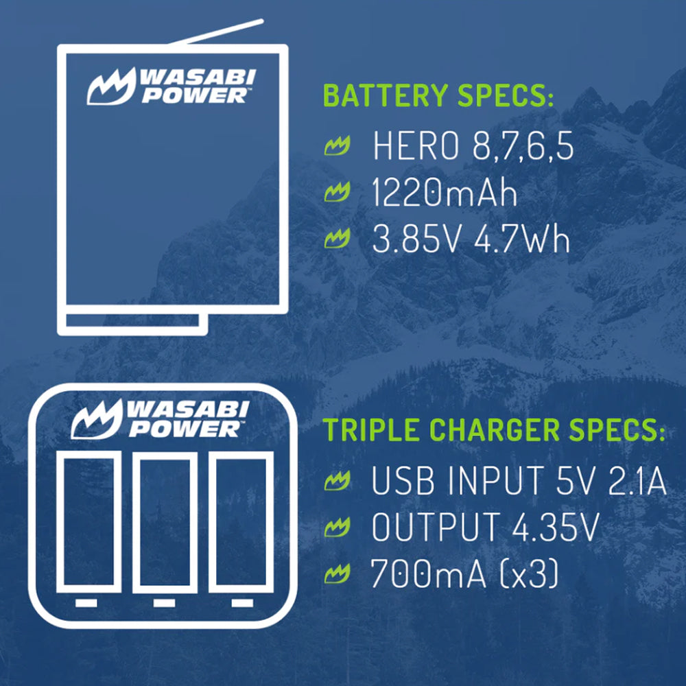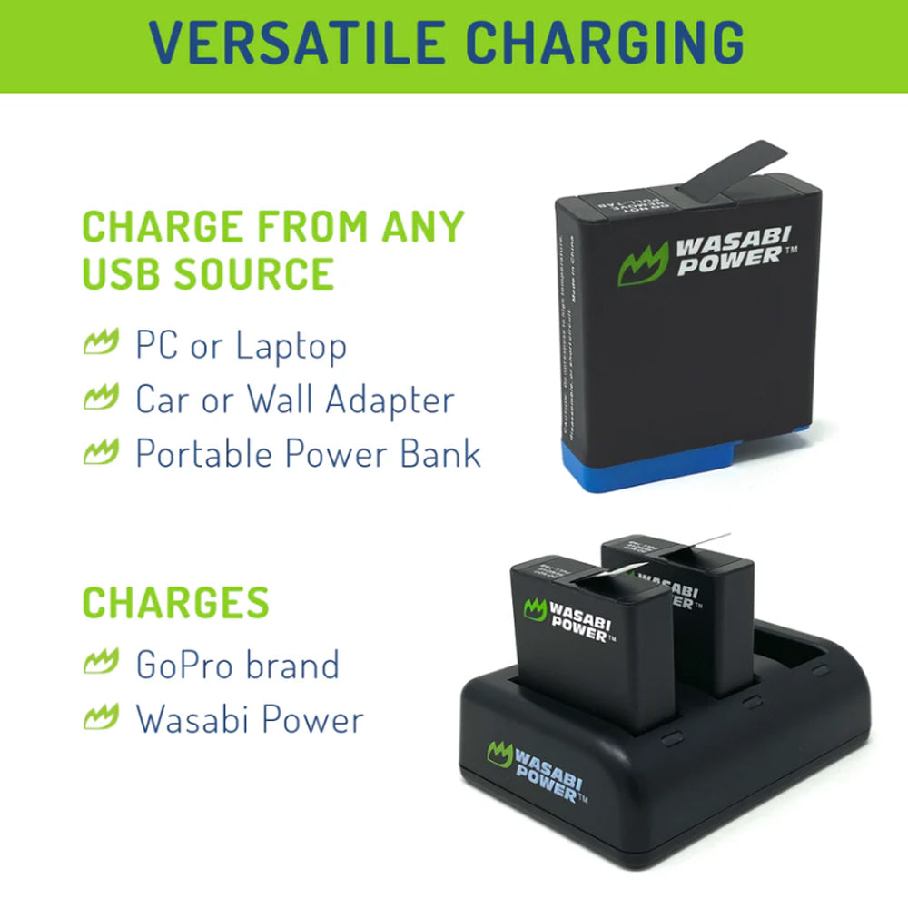 Get Wasabi Power for your HERO 8 Black, HERO 7 Black, HERO 6 Black, HERO 5 Black and HERO camera (2018 model). Featuring 1220mAh, premium grade-A cells. This battery works great as a spare or replacement. The Wasabi Power battery is completely compatible with all original equipment including the charger and camera. Includes 2 batteries and triple USB charger with micro USB and USB Type-C Ports.