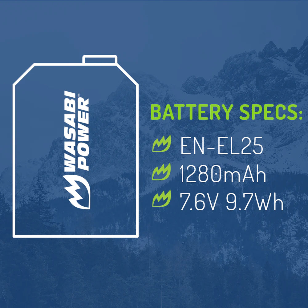 This Wasabi Power dual USB charger fully charges 2 EN-EL25 batteries at a time from any USB power source.