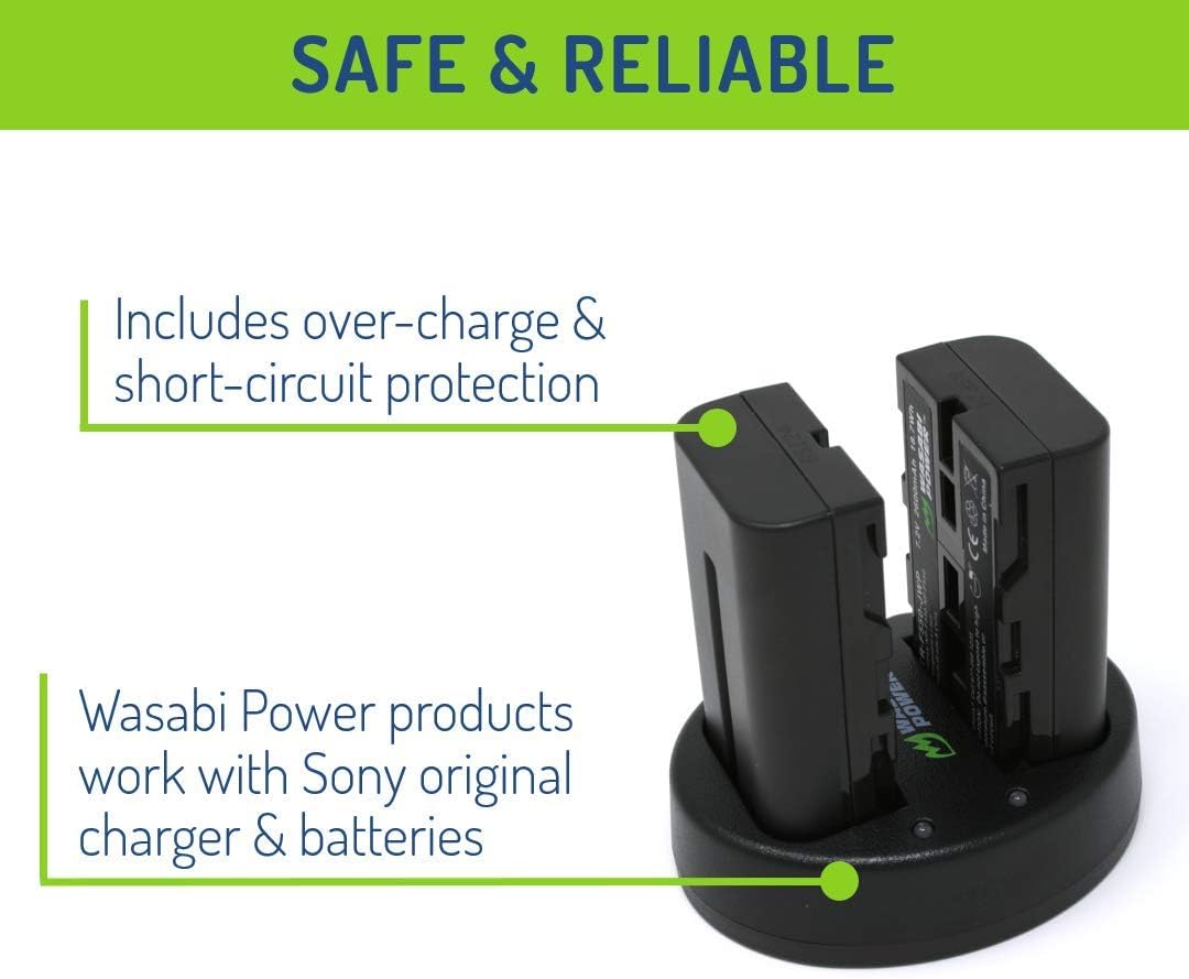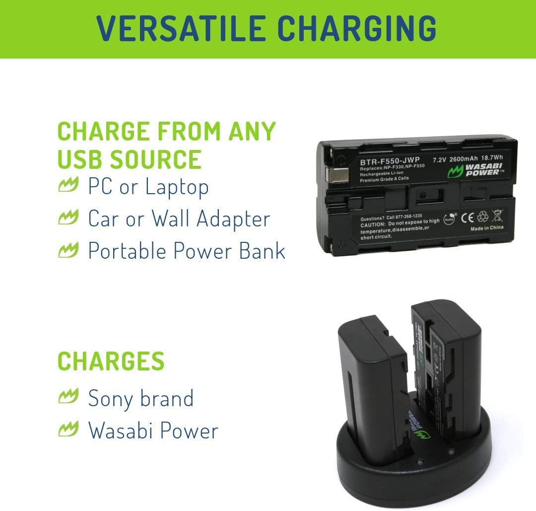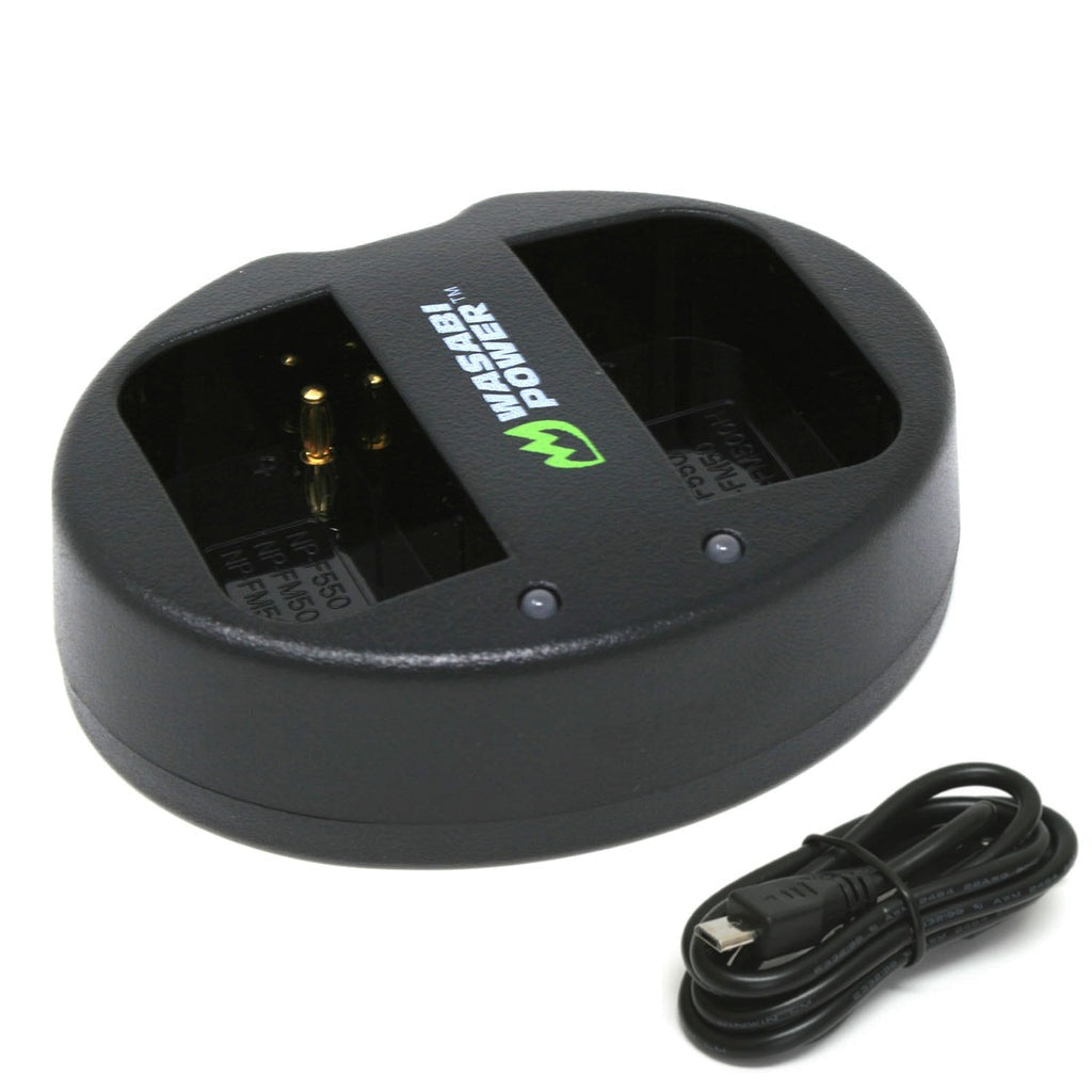 This Wasabi Power charger fully charges 2 batteries at a time from any USB power source for Sony L and M series batteries (NP-F330, NP-F550, NP-F570, NP-F55H and NP-F500H).
