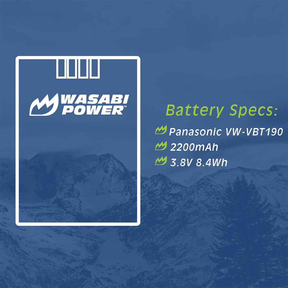 This Wasabi Power battery and charger kit includes 2 batteries for the Panasonic VW-VBT190 and one US charger with a 12V car adapter and European adapter. All items meet or exceed OEM standards.