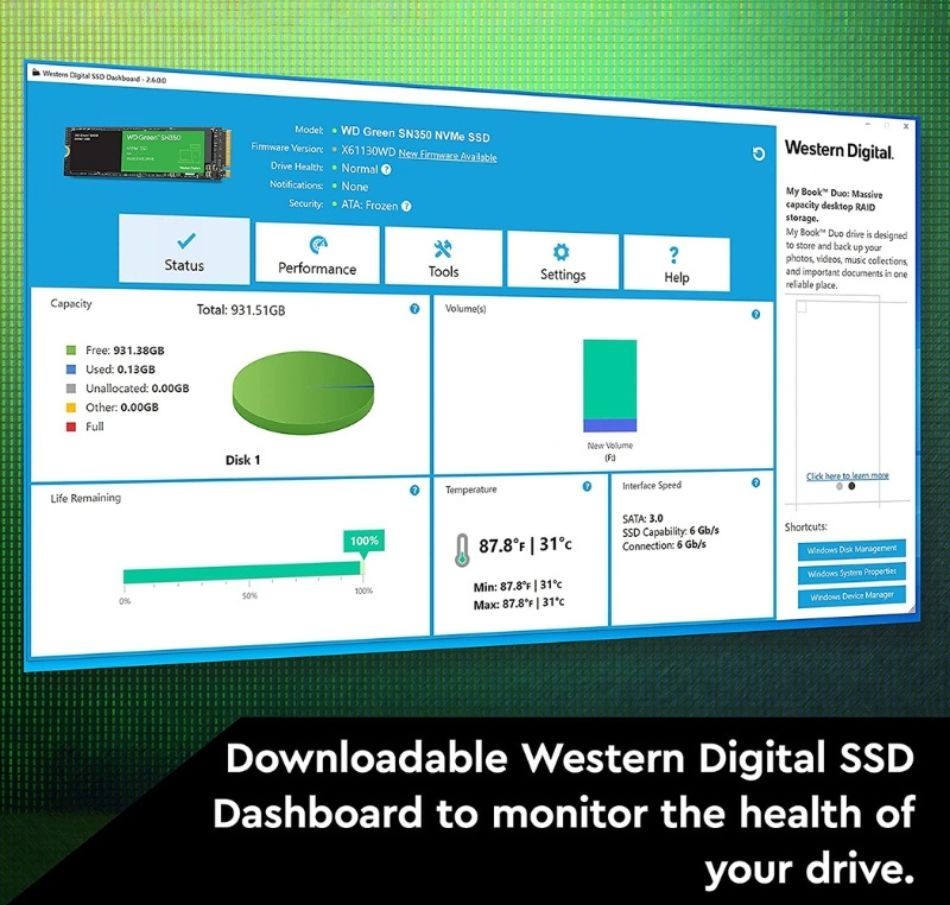 Downloadable Western Digital® SSD Dashboard monitors the health and usage of your drive