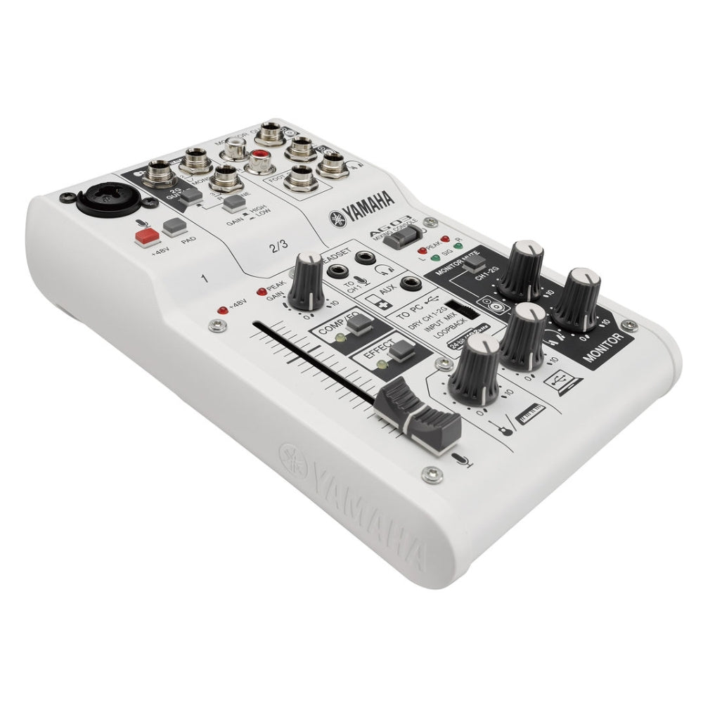 The AG03 from Yamaha is a compact 3-input mixer and USB interface with built-in DSP for sound-reinforcement and recording of small performances, podcasts, lectures and similar applications. Capable of recording and playback of high-resolution 24-bit/192 kHz sound, this mixer features one XLR/1/4" combo mic/line input, as well as stereo 1/4" line inputs with level control, and a Hi-Z switch for direct recording of guitar and bass.