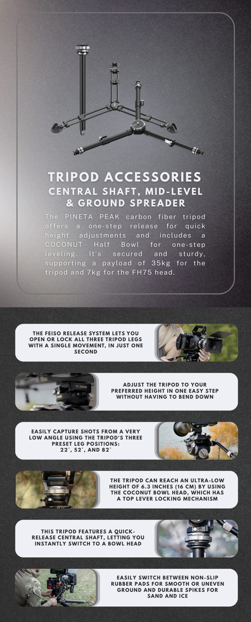 YC ONION FEISO Release System QR Central Shaft, Mid-Level and Ground Spreader for PINETA PEAK Carbon Fiber Professional Tripod Spare Parts & Accessories with Quick-Release Design, Adjustable Angles, Enhanced Stability & Support