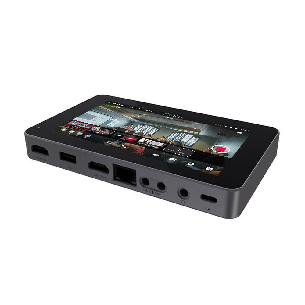 Make the YoloBox Mini Ultra-Portable All-in-One Smart Live Streaming Encoder & Monitor from YoloLiv the central hub for recording from your camera while live streaming from from virtually anywhere for a simple and easy way to capture and stream without a computer. The YoloBox Mini can simultaneously broadcast up to three video streams via Wi-Fi, RJ45 Ethernet, or 4G LTE with a separately available SIM card and subscription. The YoloBox Mini features a USB input, one HDMI input and one HDMI output for local viewing, both mic and line analog audio inputs, a Qualcomm 660 encoder/processor, and a 5.5" LCD touchscreen with 500 cd/m² brightness.