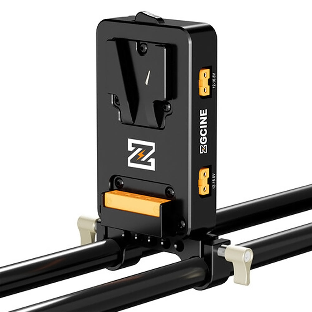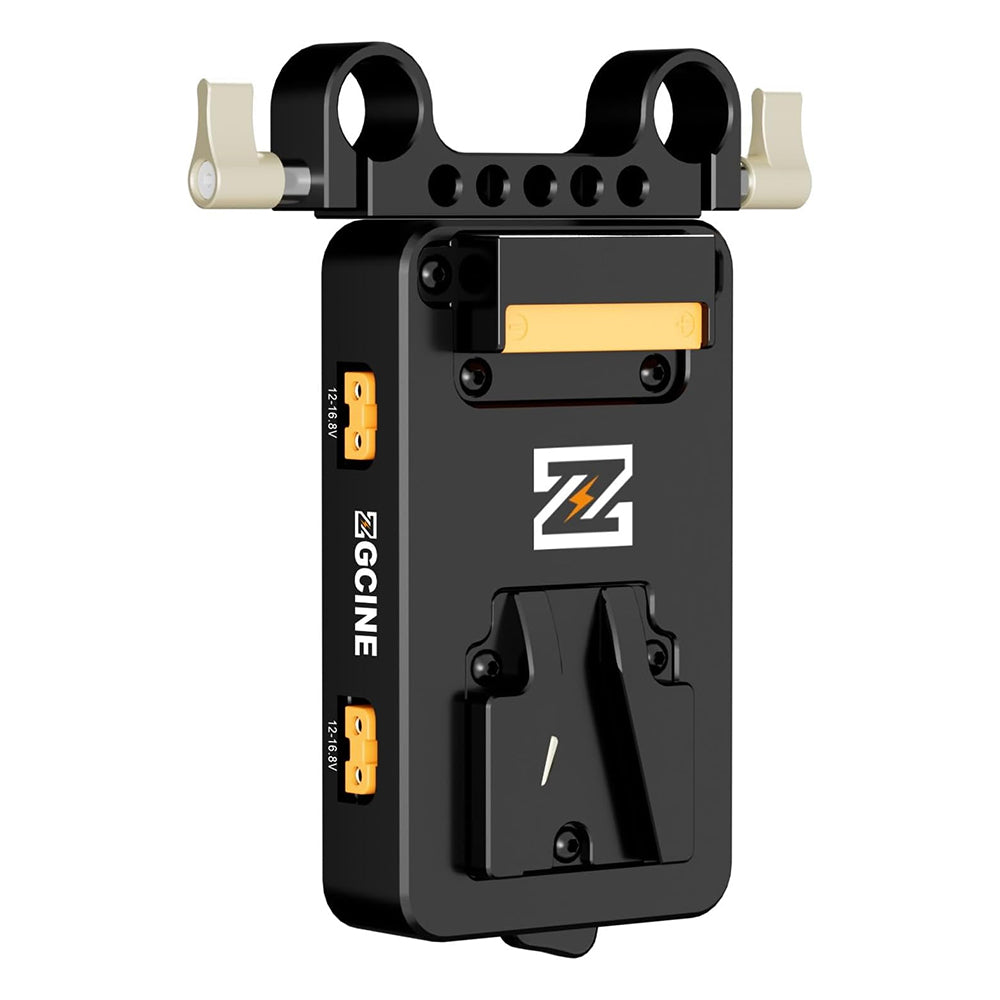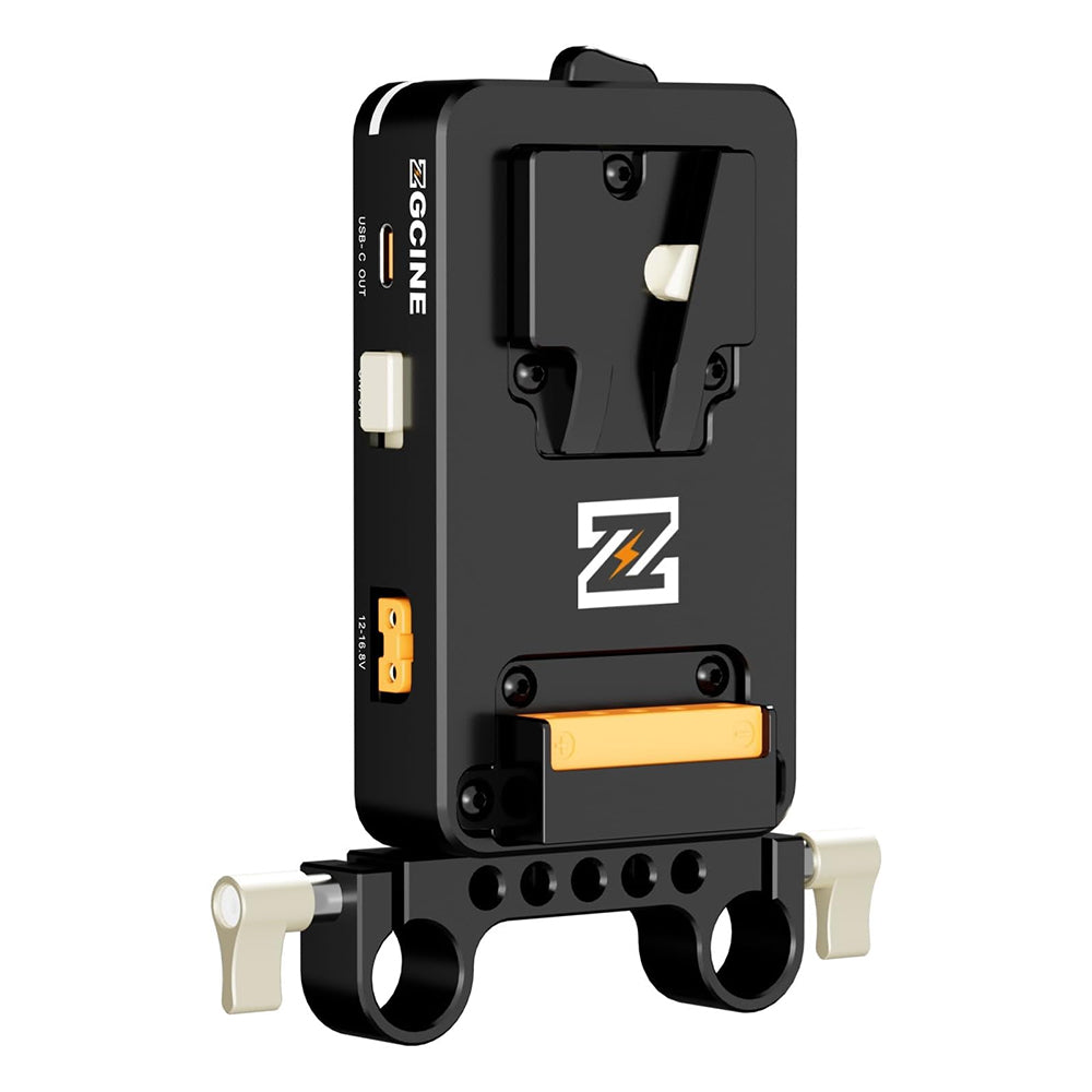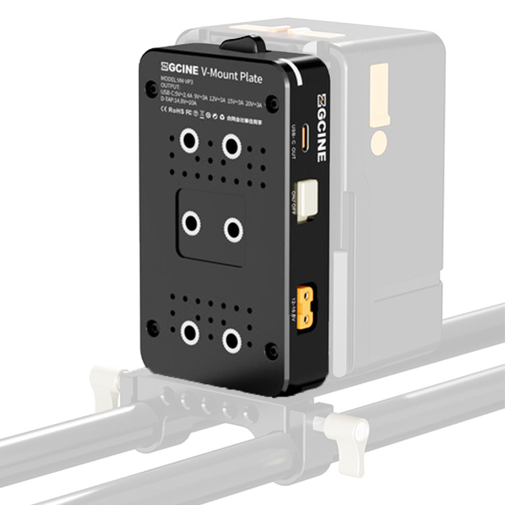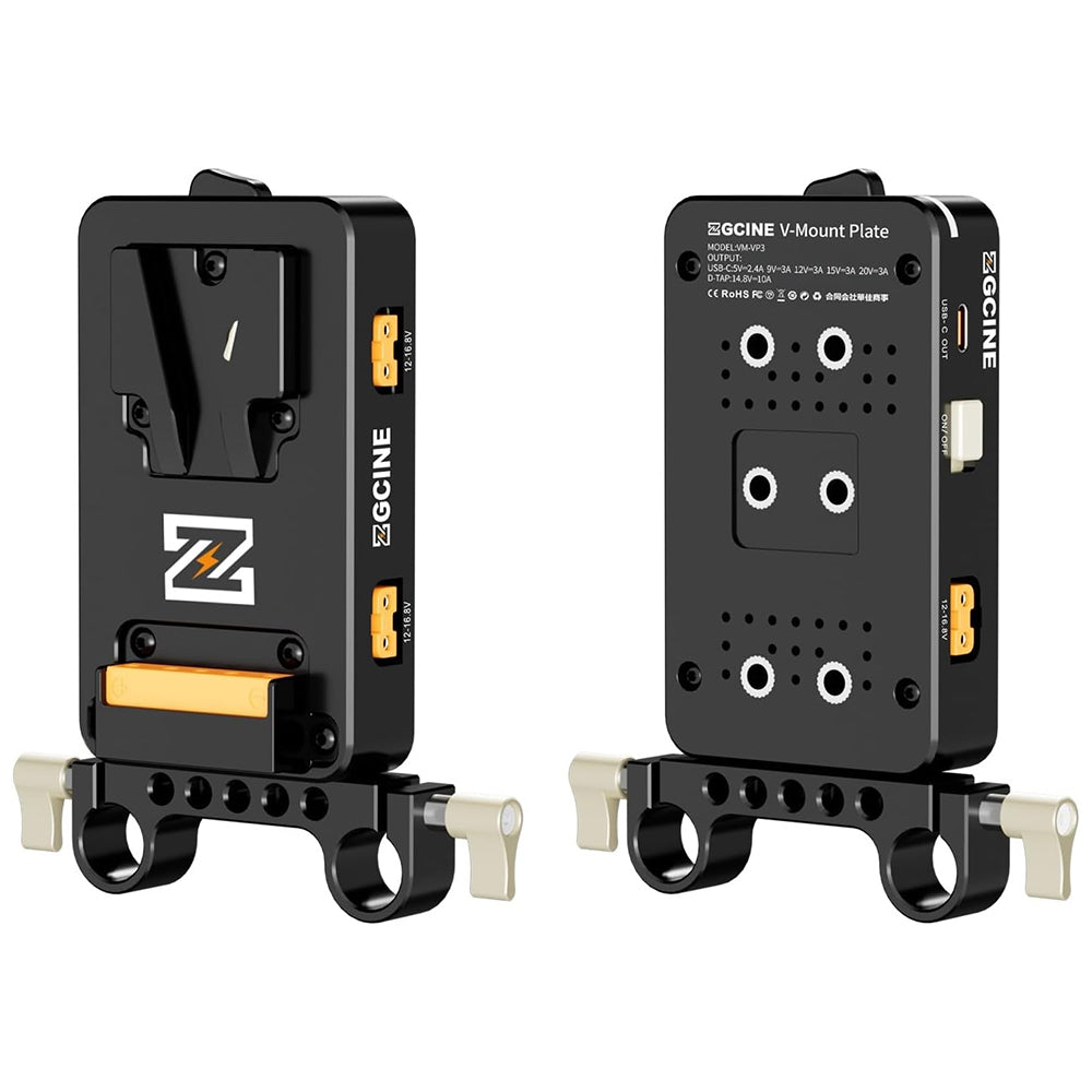 The ZGCINE VM-VP3 is a robust and compact V-Mount battery plate designed to deliver reliable power to cameras and accessories on the move. It features three 14.8 V D-Tap outputs for powering lights and peripherals, plus a versatile USB-C PD port that delivers 5–20 V/3 A—perfect for USB-C devices like monitors and chargers. Engineered for seamless integration, it includes a 15 mm rod clamp and multiple 1/4"-20 mounting threads for secure positioning on standard rigs.